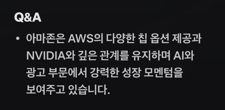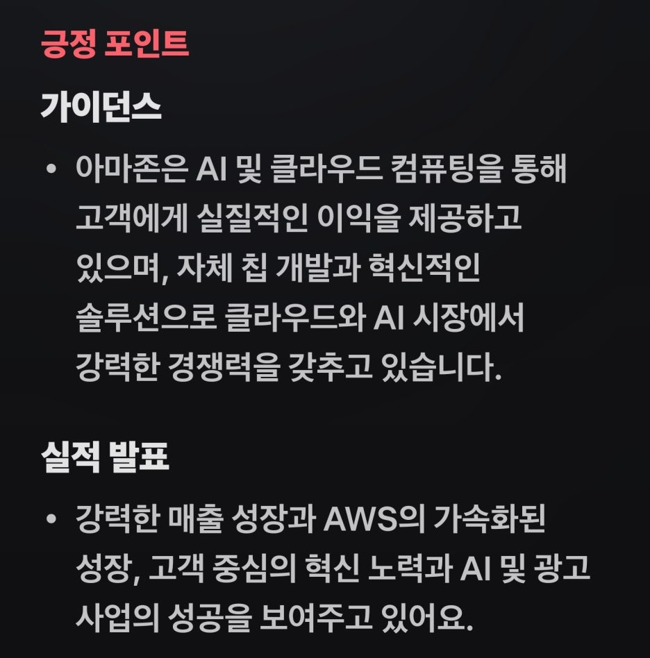 - 미래 투자 비용 우려: 아마존은 급격한 확장과 AI 관련 지출 증가로 상당한 자본 투자를 요구하며, 이는 단기적인 비용 증가로 이어져 수익성에 부정적인 영향을 미칠 수 있다고 경고했습니다.
