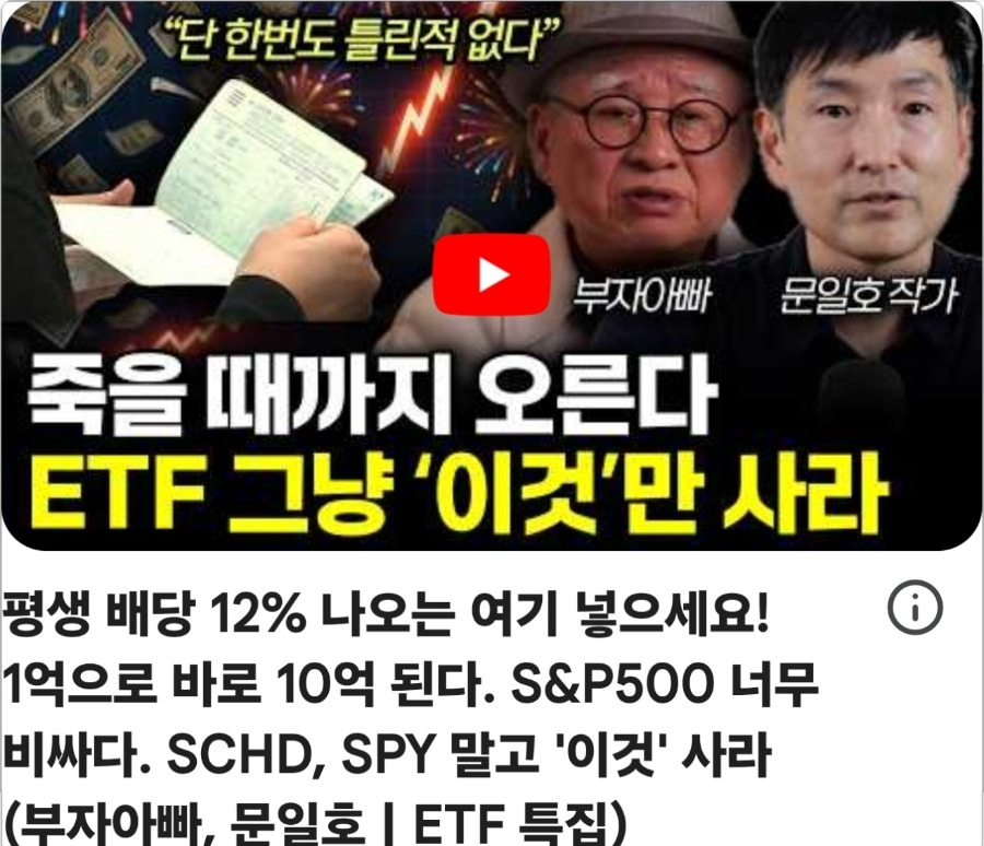 유튜브 영상 '떠먹여주는TV' 채널의 "[평생 배당 12% 나오는 여기 넣으세요! 1억으로 바로 10억 된다. S&P500 너무 비싸다. SCHD, SPY 말고 '이것' 사라 (부자아빠, 문일호ㅣETF 특집)]" 영상입니다. 촬영일은 25년5월8일 입니다.