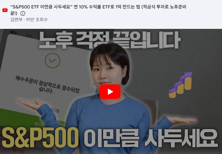 우연히 유튜브를 시청하다가 "김짠부" 영상을 접하게 되었습니다. 조회수가 90만이 넘는 조회수가 나와 있어서 어떤 영상인지 보게 되었고, 영상에 대한 내용을 정리하고 나의 생각을 블로그에 남기게 되었습니다. 왜 77만 인지 알수 있었으며, 영상은 간결하고 이해하기 너무 쉽게 미국 S&P500에 대해 설명을 하였다.