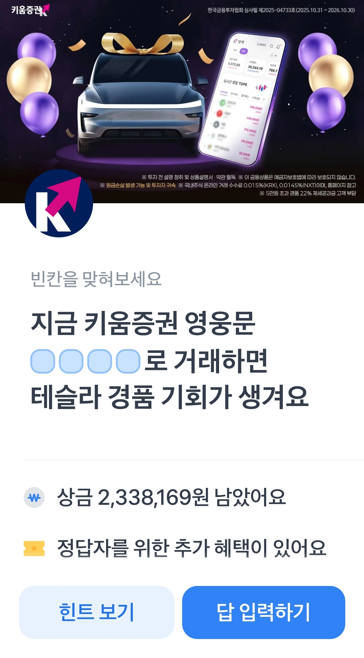 토스행운퀴즈 11월10일 정답공유 지금키움증권영웅문ㄱㅍㅁㄷ로거래하면테슬라경품기회가생겨요