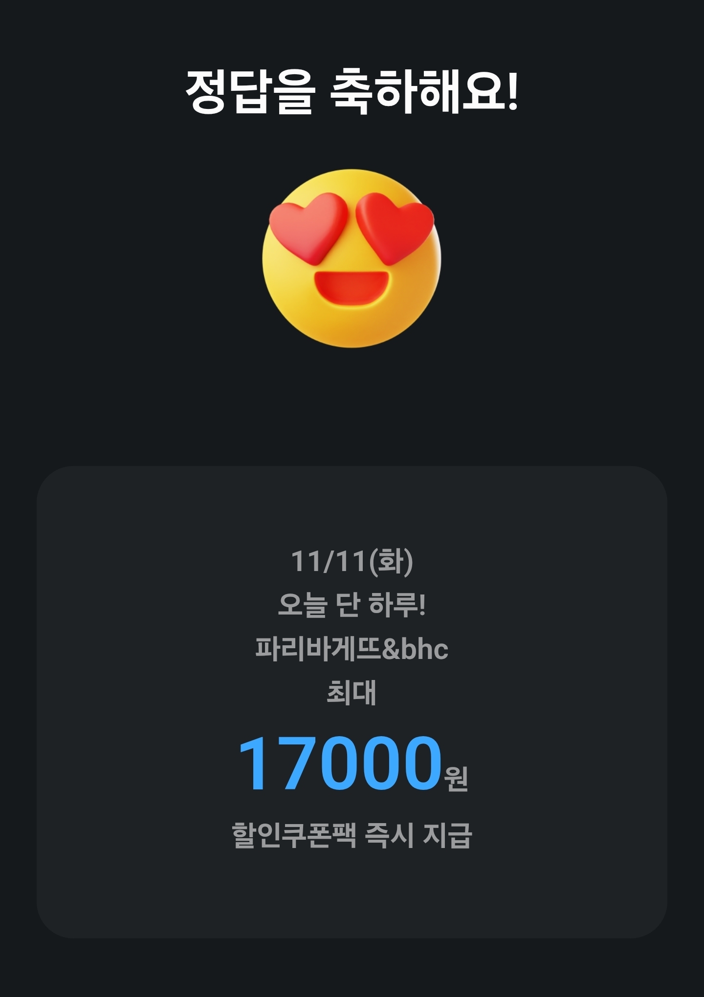 카카오퀴즈타임 11/11(화)오늘단하루!파리바게뜨&bhc최대00000원할인쿠폰팩즉시지급
