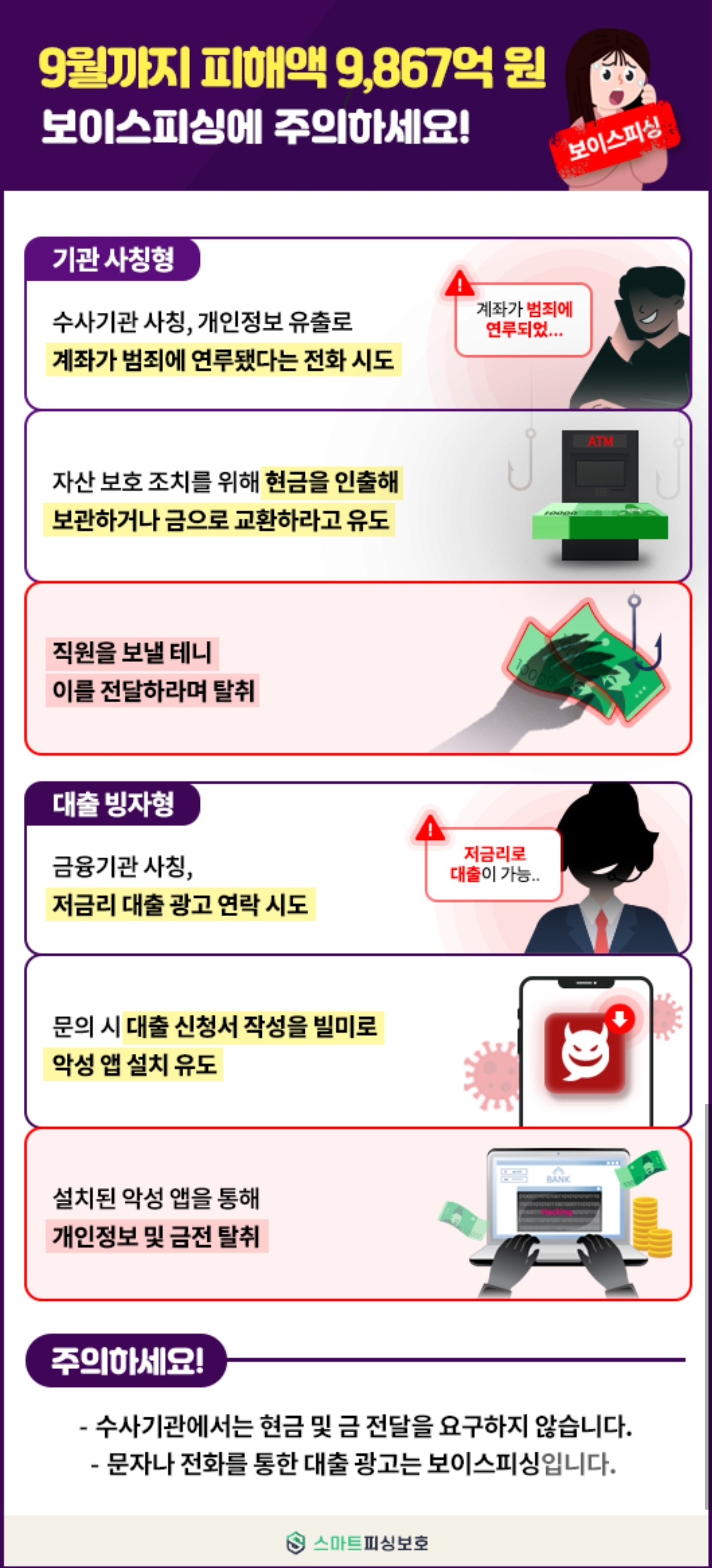 ○ 최근 경찰청에서 발표한 자료에 따르면 올해 9월까지 발생한 보이스피싱 피해액은 9,867억 원 으로 전년 동기 5,174억 원 대비 90%이상 증가 한 것으로 나타났습니다.