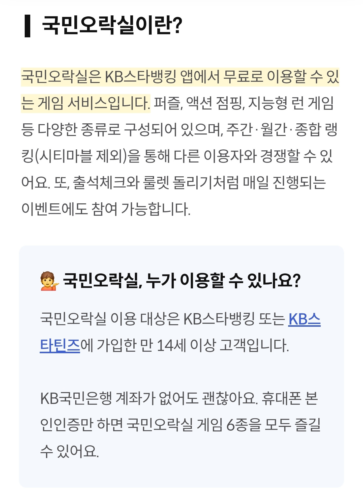 • 이용 편의성 (간편 회원): KB국민은행 계좌가 없는 고객도 휴대폰 본인확인을 통한 '간편회원' 가입만으로 만 14세 이상이면 누구나 모든 게임을 이용할 수 있습니다.