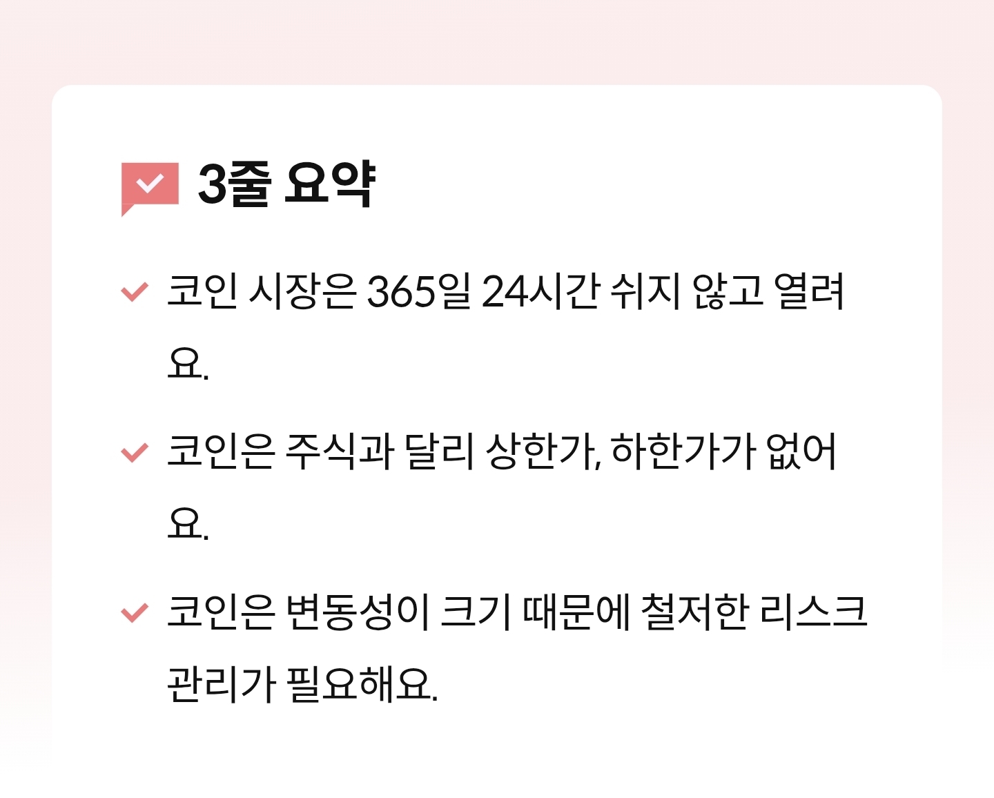 주식은 기업 실적, 거래 지표 등 비교적 명확한 요인에 따라 가격이 움직이는 반면, 코인은 실적이나 재무 상태 같은 뚜렷한 지표가 없어 가치를 예측하기 비교적 어려워요. 코인 가격은 특정 인사의 발언이나 특정 국가의 규제 발표, 기술적 변화 등의 영향을 많이 받아요