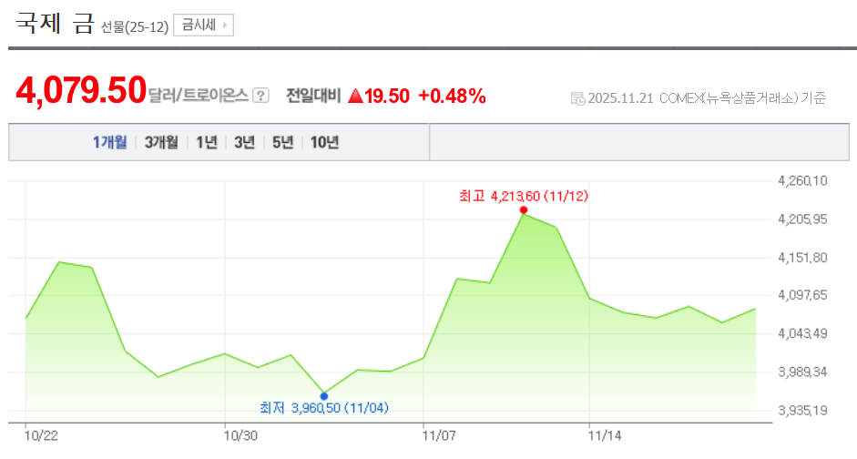 - 국제 금 시세 데이터: GoldPrice.org & Kitco Metals (Nov 2025 Data)