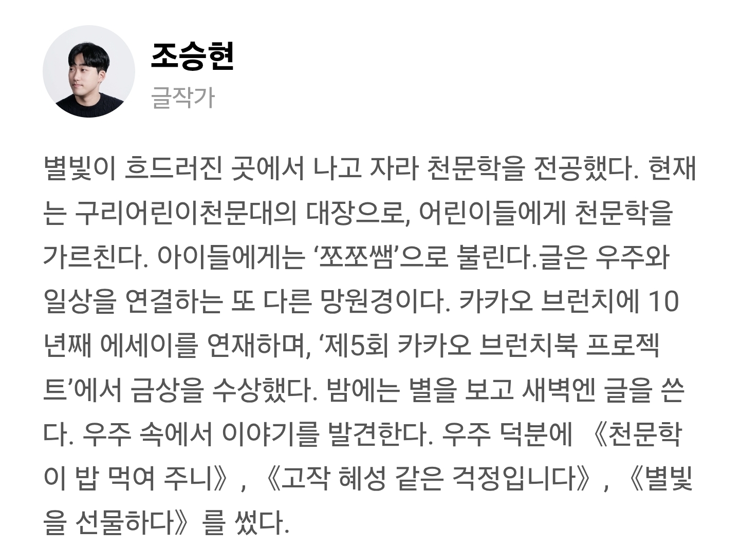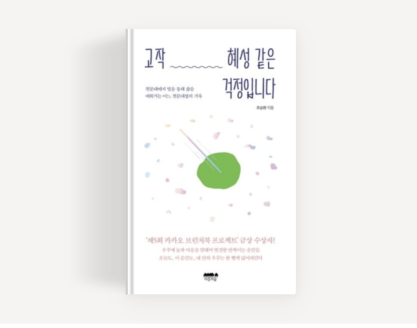 카카오 브런치를 통해 5년간 꾸준히 글을 써온 저자는 ‘제5회 카카오 브런치북 프로젝트’에서 금상을 차지했고, 그의 첫 책 《천문학이 밥 먹여 주니》를 출간한 바 있다. 그의 두 번째 책 《고작 혜성 같은 걱정입니다》에서는 천문대의 일상과 “우주에 눈과 마음을 맞대며 발견한 반짝이는 순간들”, 별을 통해 삶을 깨달아가는 과정을 담았다.