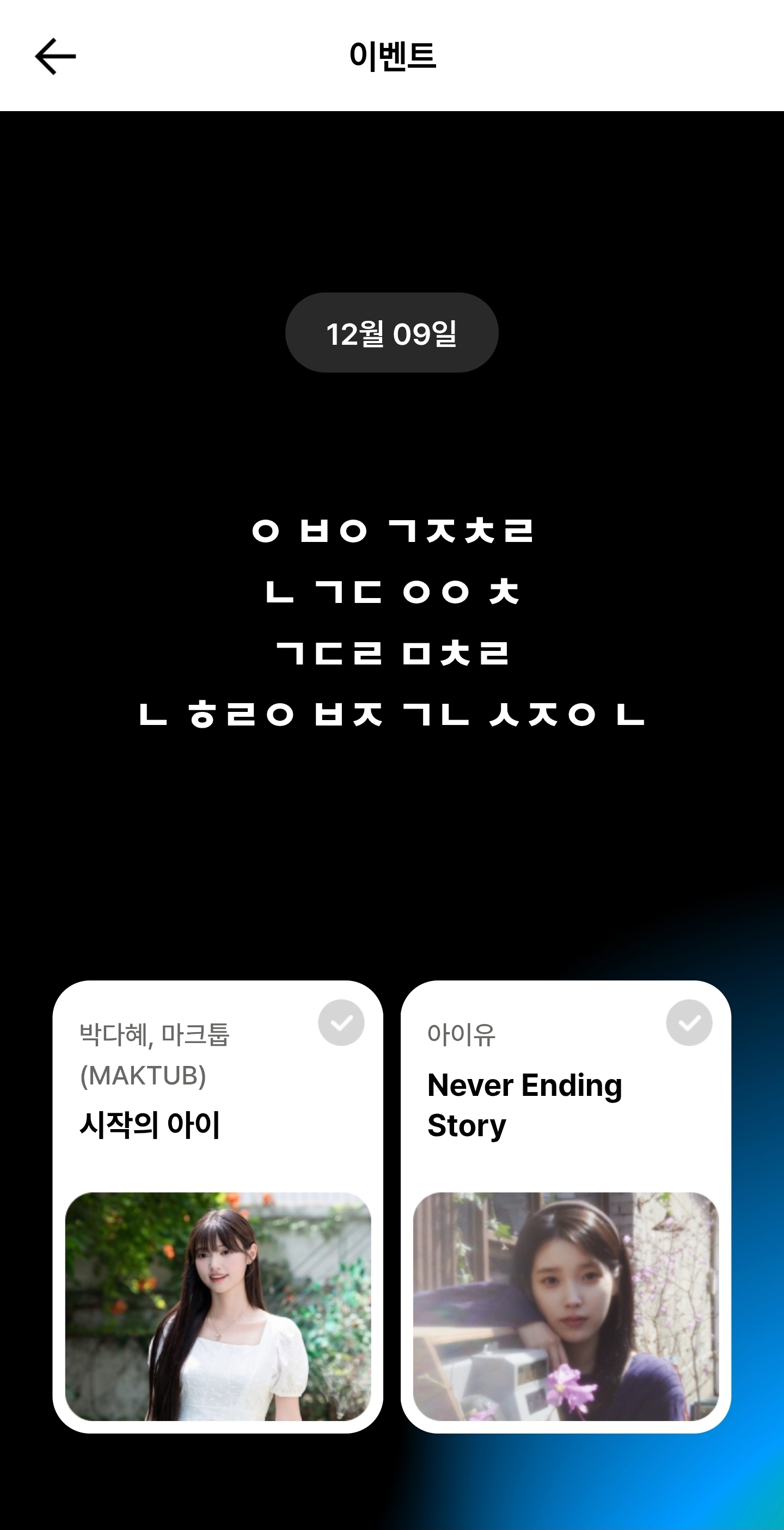 화면 아래에는 선택 옵션으로 박다혜·마크툽 〈시작의 아이〉와 아이유 〈Never Ending Story〉 두 곡이 제시되어 있네요.