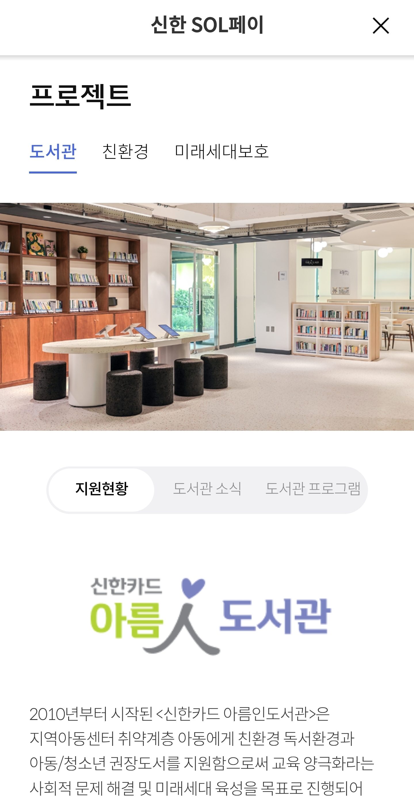 2010년부터 시작된 <신한카드 아름인도서관>은 지역아동센터 취약계층 아동에게 친환경 독서환경과 아동/청소년 권장도서를 지원함으로써 교육 양극화라는 사회적 문제 해결 및 미래세대 육성을 목표로 진행되어 왔습니다.