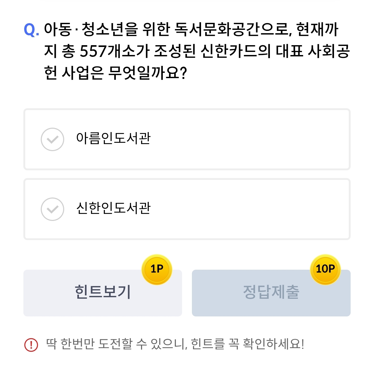 아동청소년을위한독서문화공간으로현재까지총557개소가조성된신한카드의대표사회공헌사업은무엇일까요?·