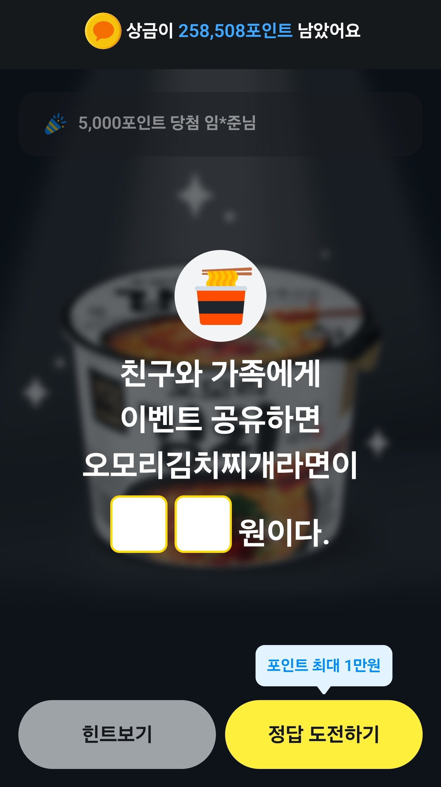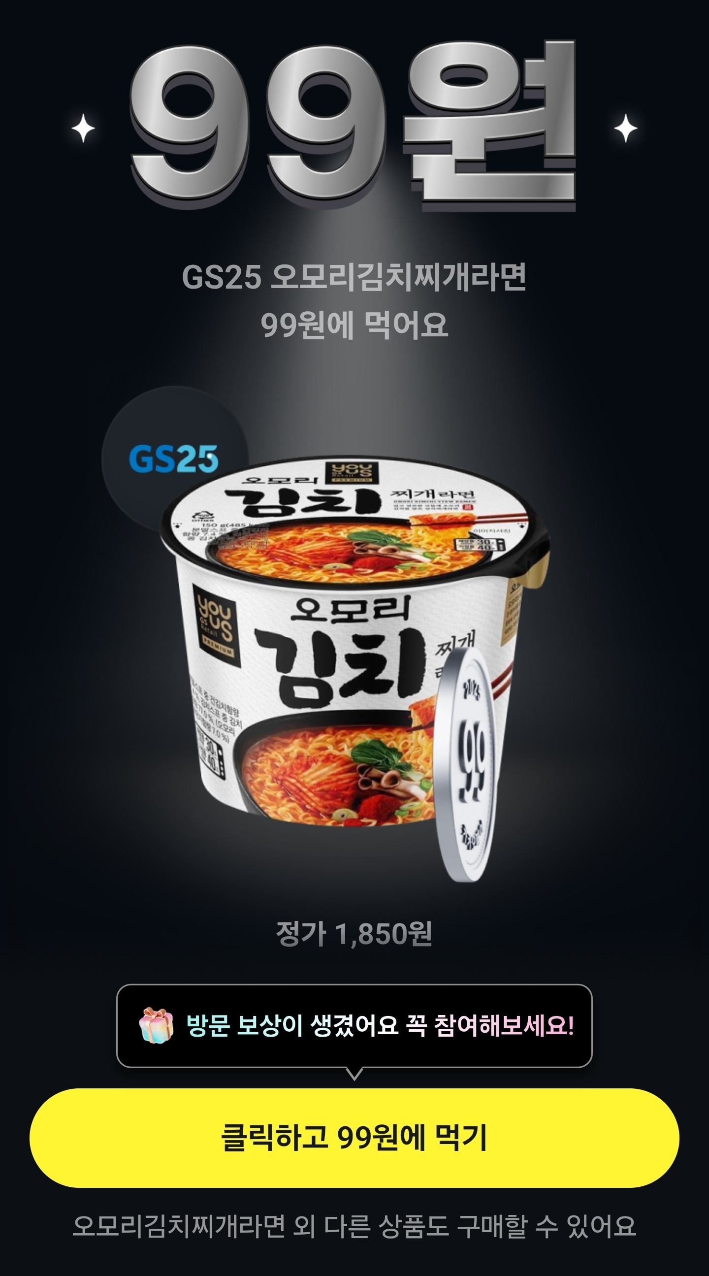 친구와 가족에게 이벤트 공유하면 오모리김치찌게 라면이 OO원이다.
